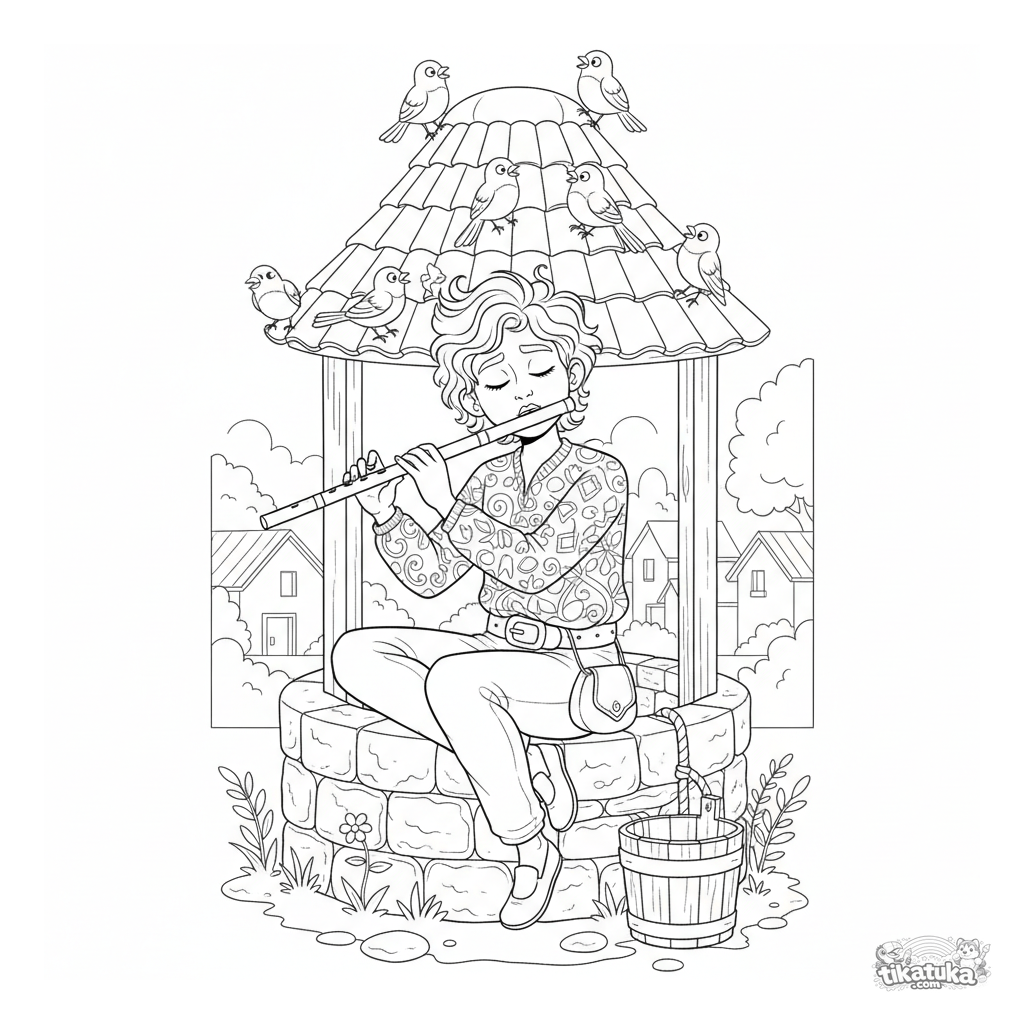 Komplexes Ausmalbild für ältere Kinder 10-12: Ein Dorfmusiker spielt Flöte am Brunnen, während Vögel sich versammeln. Detaillierte Szene im Feldbestimmungsbuch-Stil.