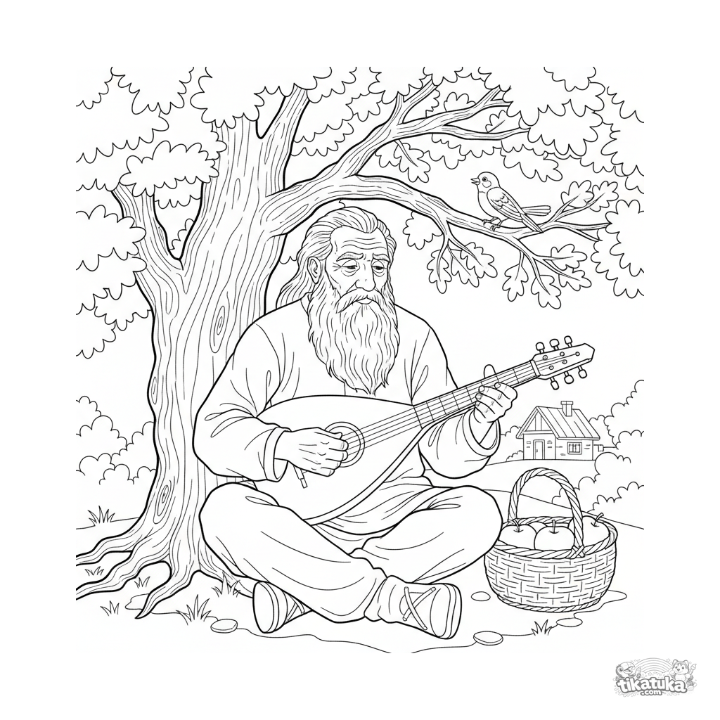Kinder-Ausmalbild: Ein Dorf-Gusli-Spieler musiziert unter einer alten Eiche. Eine friedliche Folklore-Szene mit einem Vogel und einem Apfelkorb, einfach auszumalen.