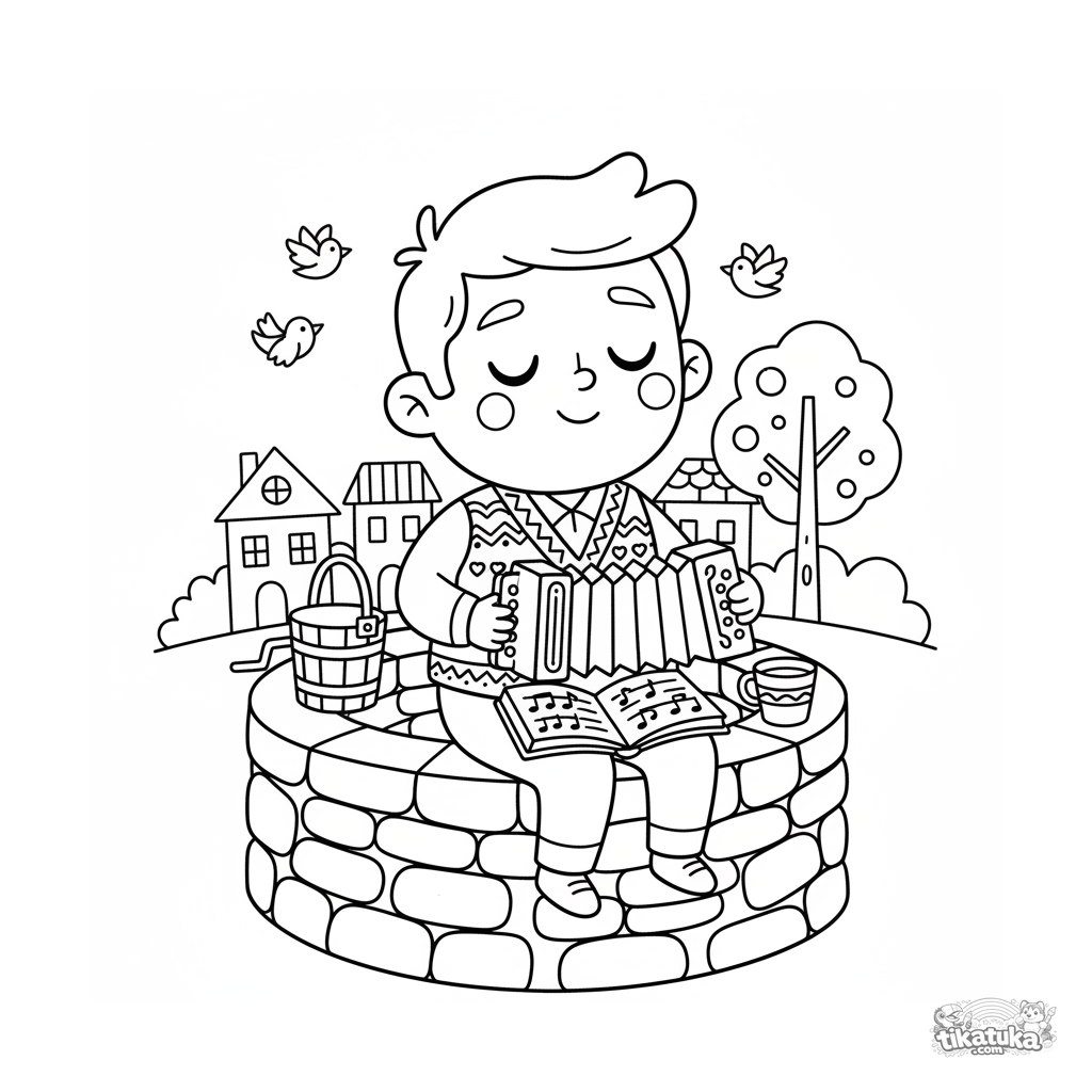 Ausmalbild für Kinder 4-6: Ein fröhlicher Dorfmusikant mit Akkordeon singt am Brunnen. Holzspielzeug-Stil, Szene zentriert.