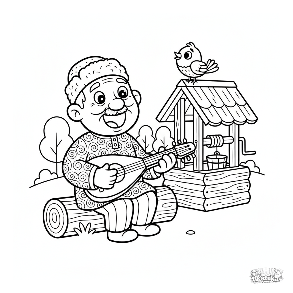 Ausmalbild für Kinder 4-6: Ein Dorfältester spielt die Gusli am Brunnen des lebendigen Wassers. Holzspielzeug-Stil mit klaren Formen.