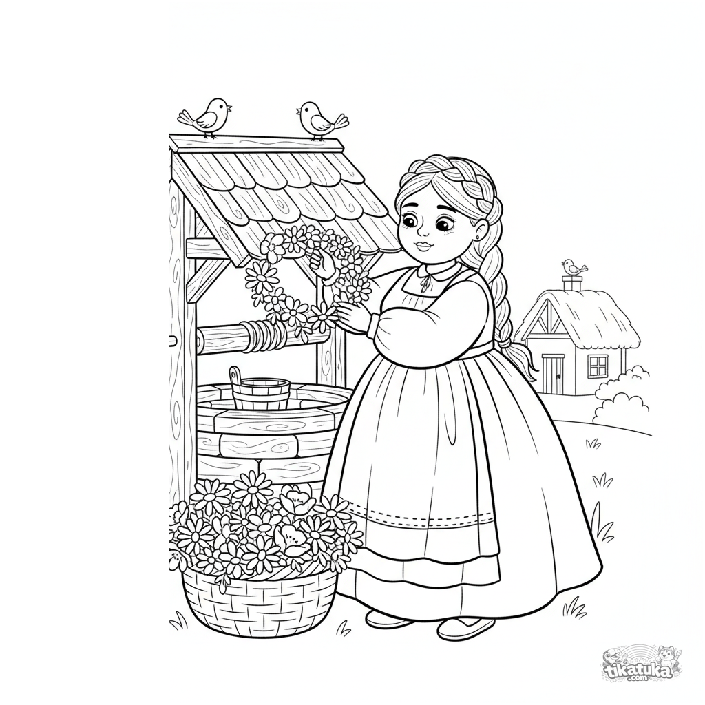Ausmalbild für Tweens 7-9: Eine Frau schmückt den Brunnen mit Blumen als dankbare Gabe. Volksstickerei-Stil mit geometrischen Mustern auf der Kleidung.