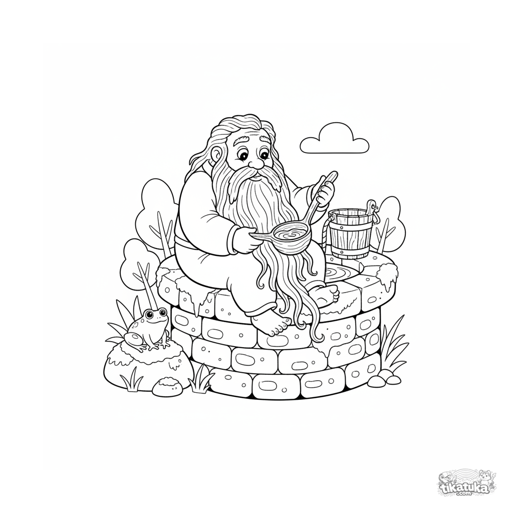 Ausmalbild für Kinder 4-6: Ein freundlicher Wassergeist an einem Brunnen mit lebendigem Wasser. Russische Folklore-Szene mit einem Frosch und einem Holzeimer.