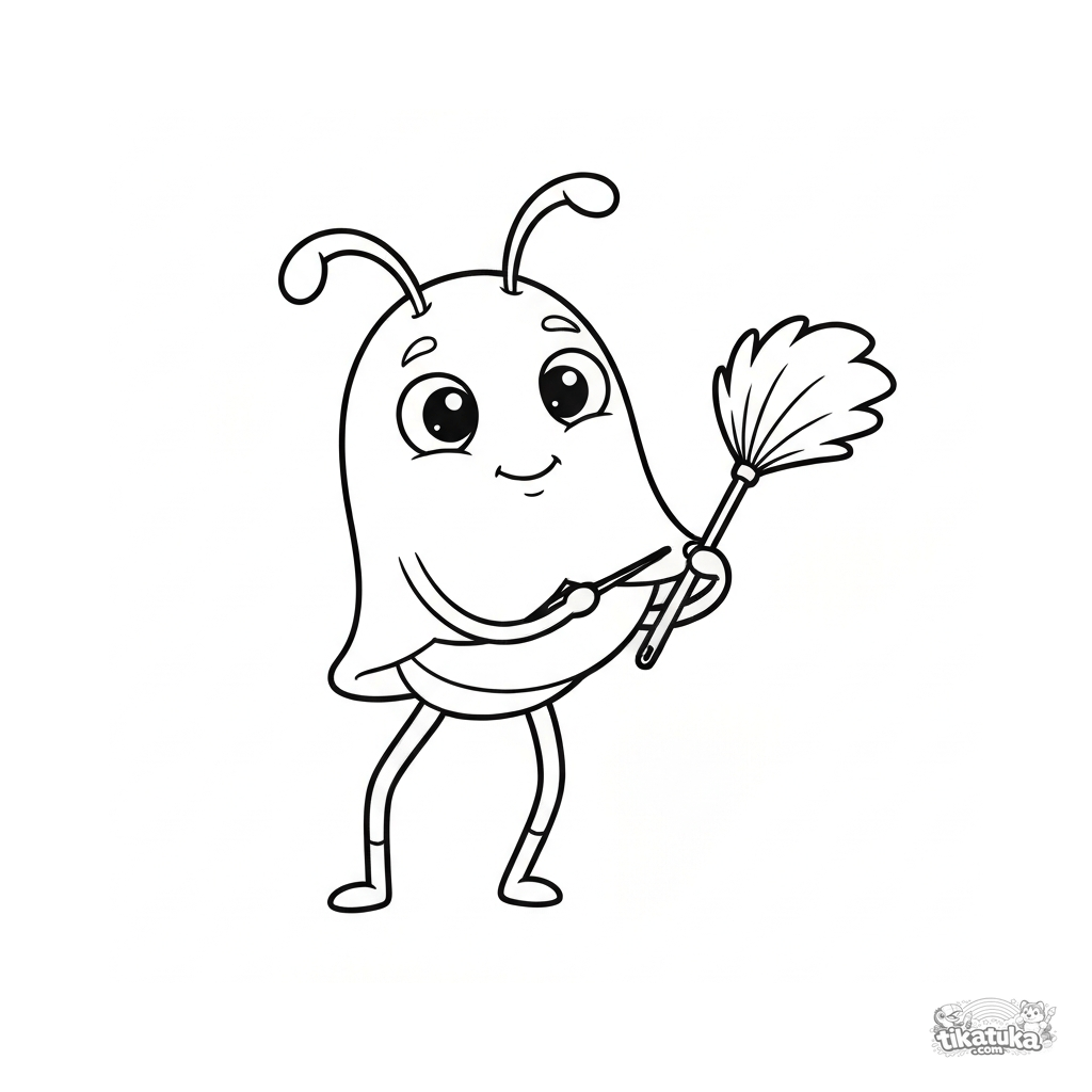 Ausmalbild für Kinder. Niedliche glockenförmige Vorticella mit Zilien putzt Möbel mit kleinem Staubwedel. Kostenlos herunterladen.