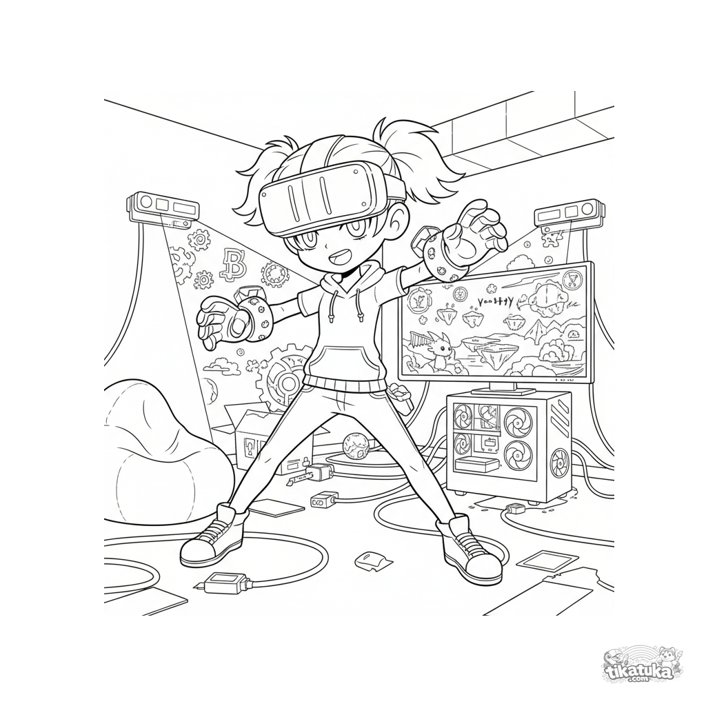 Ausmalbild für Kinder von 10-12 Jahren: ein Spieler, der vollständig in virtuelle Realität in einem speziell ausgestatteten Keller eintaucht. Energiegeladene Szene im Anime-Shonen-Lite-Stil.