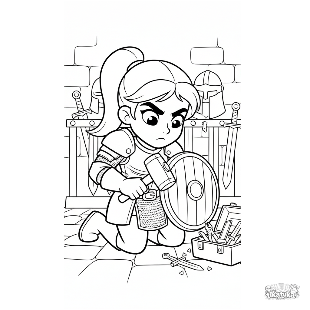 Ausmalbild für 7-9 Jahre: Eine Kriegerprinzessin in Rüstung repariert konzentriert ihren Schild in einer Burgwaffenkammer. Eine actionreiche Szene mit Werkzeugen und Waffen.