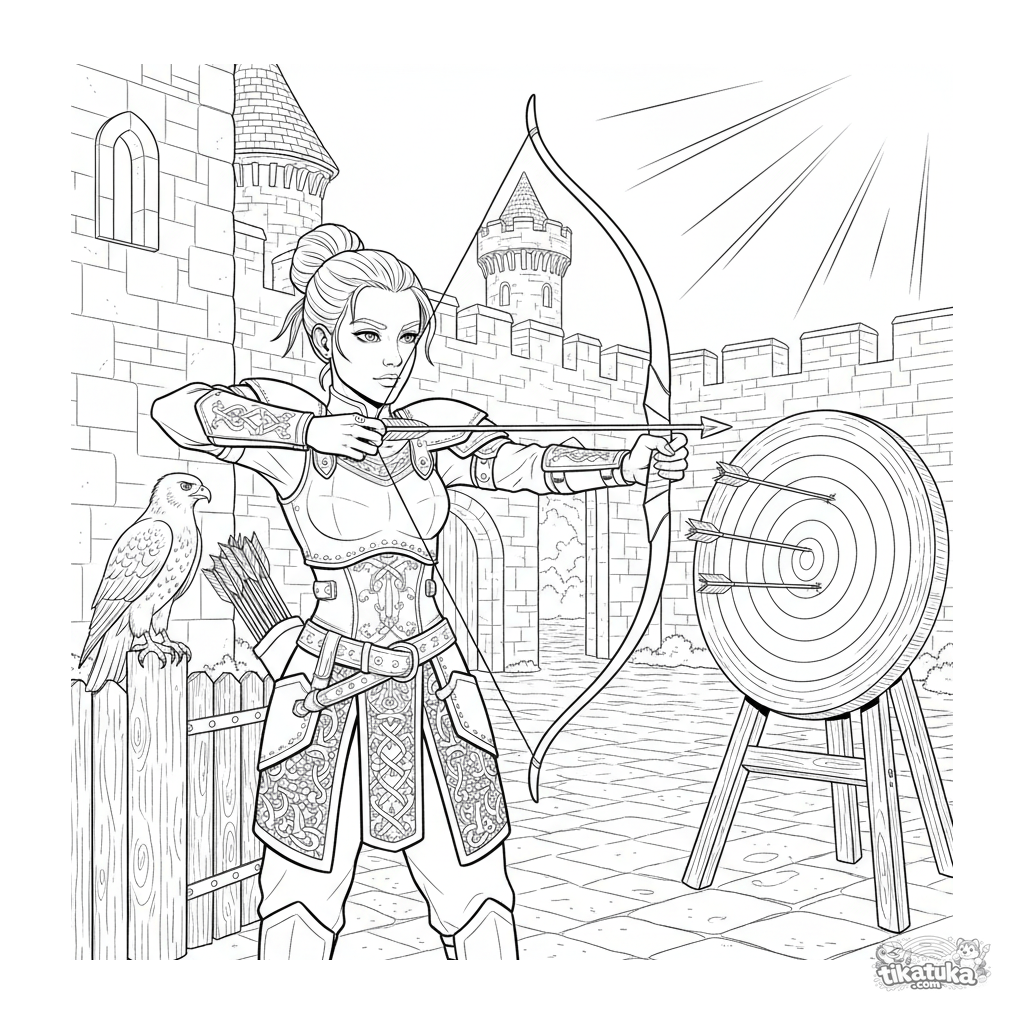 Detailliertes Ausmalbild für Kinder 10-12: Eine Kriegerprinzessin in Rüstung zielt mit einem Bogen auf ein Strohziel im Schlossinnenhof.