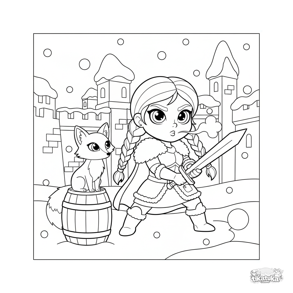 Ausmalbild für Kinder 7-9: eine Kriegerprinzessin trainiert mit einem Schwert in einem verschneiten Hof, beobachtet von einem Fuchs. Dynamische Winterszene.