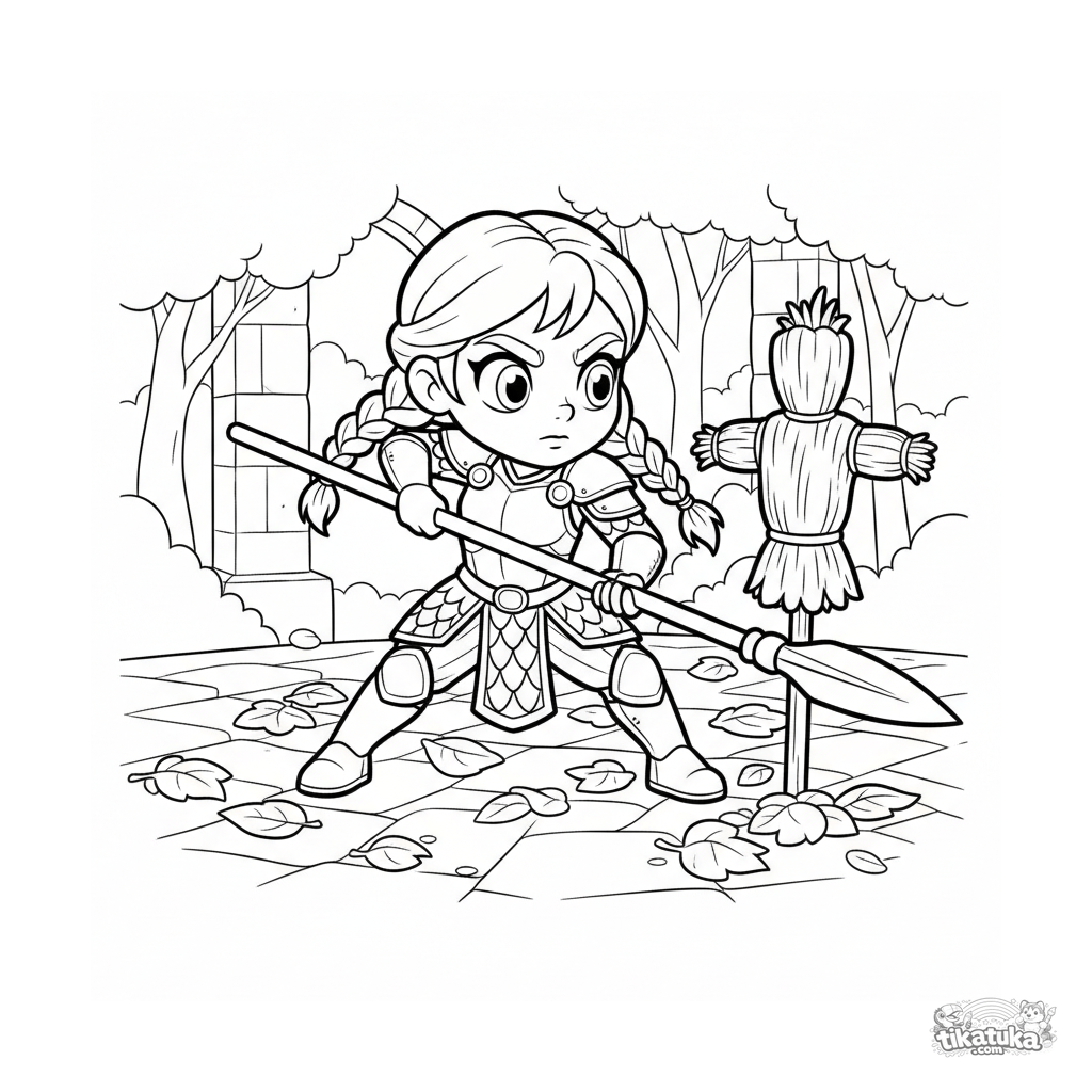 Ausmalbild für Tweens 7-9: Eine Kriegerprinzessin trainiert mit einem Speer in einem herbstlichen Schlossinnenhof, Blätter fallen.