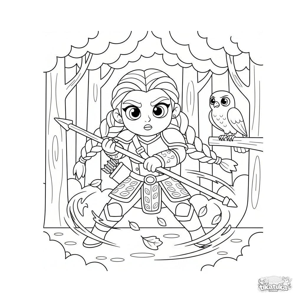 Ausmalbild für 7-9 Jahre: Eine Krieger-Prinzessin trainiert mit einem Stab in einer Herbstwaldlichtung. Dynamische Pose, Herbstblätter, Rüstungsdetails.