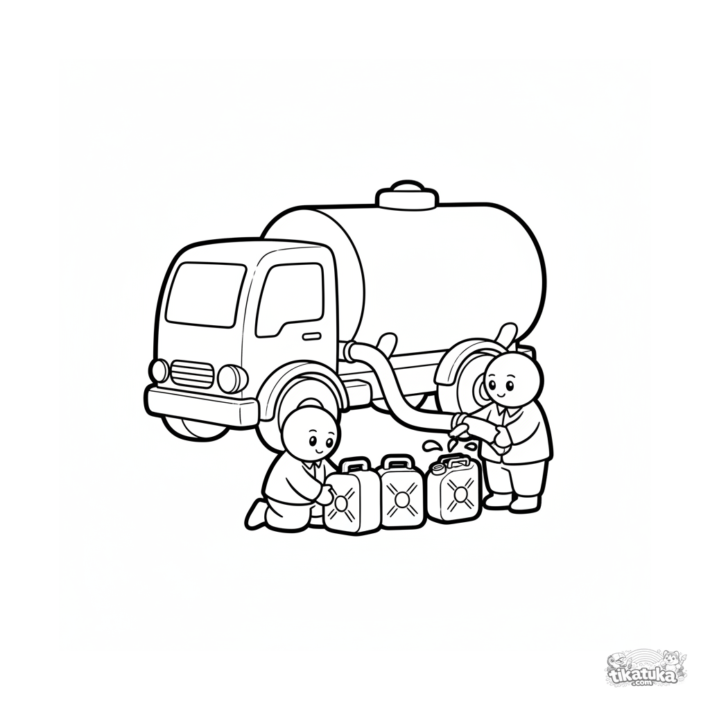 Sehr einfaches Ausmalbild für Kleinkinder 2-3: Ein großer Wassertankwagen und Soldaten, die am Rand des Hauptquartierlagers Kanister mit Wasser auffüllen.