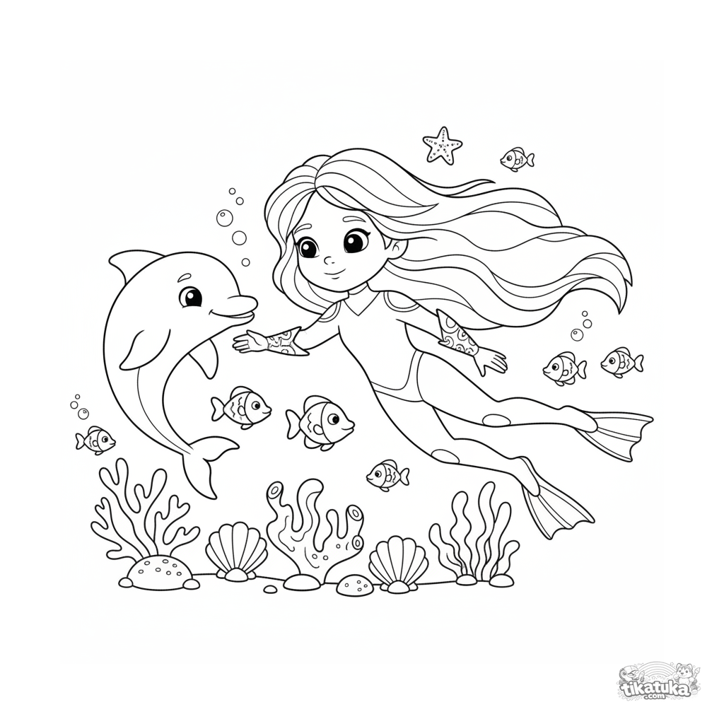 Ausmalbild für Tweens 7-9: Ein Wasserheld im blauen Anzug erkundet ein farbenfrohes Korallenriff mit einem freundlichen Delfin-Begleiter.