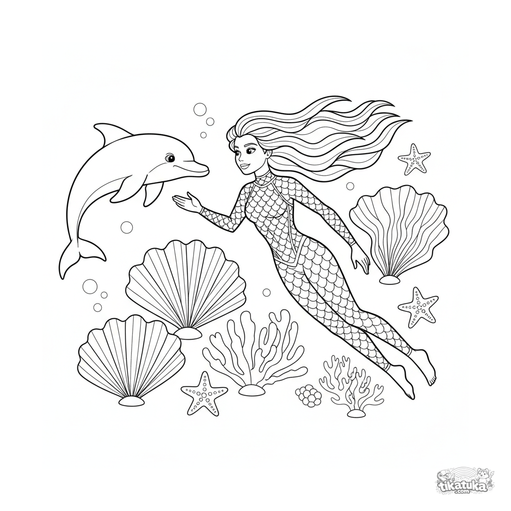 Ausmalbild für 7-9 Jahre: Ein Superheld mit Wasserkräften erkundet ein farbenfrohes Korallenriff zusammen mit einem freundlichen Delfin.