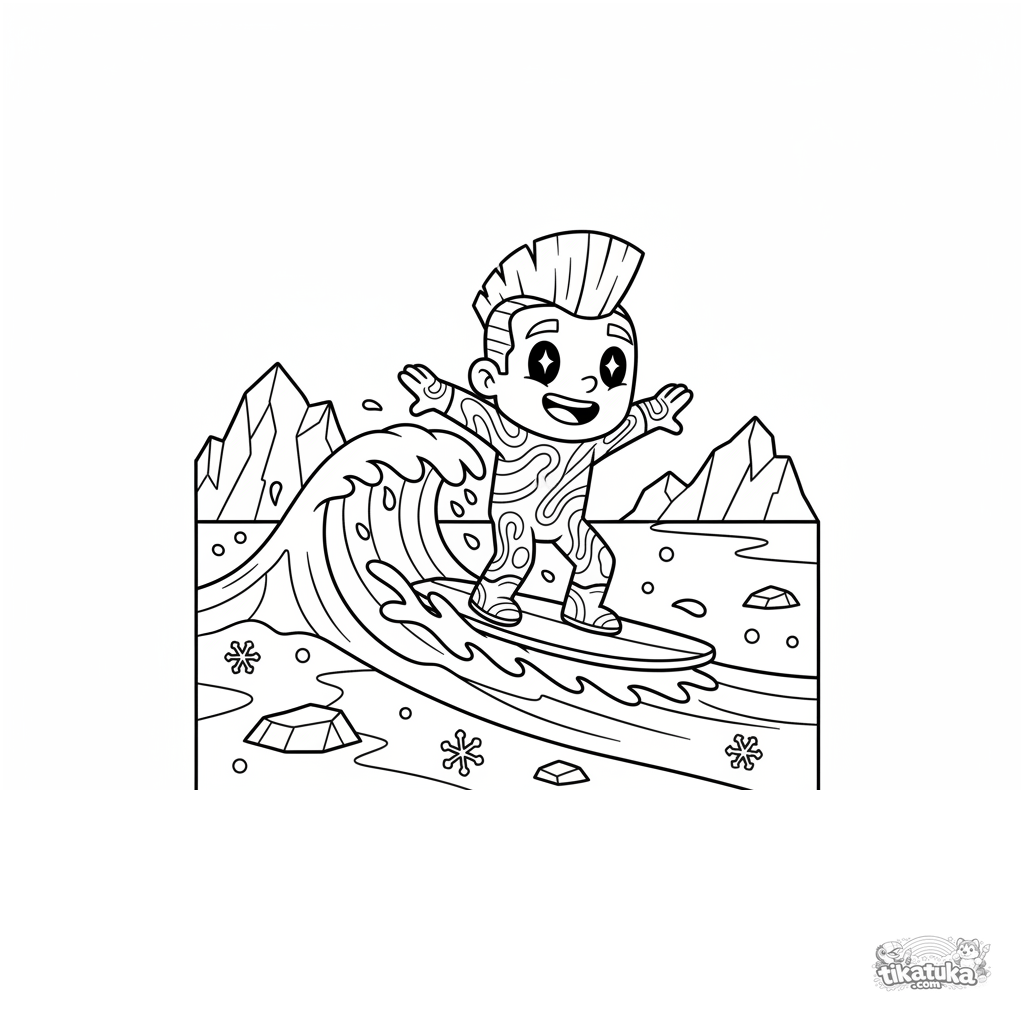 Ausmalbild für Kinder 7-9: Ein wasserbetriebener Superheld surft auf einer Welle über einen gefrorenen arktischen See, fröhliche Stimmung.