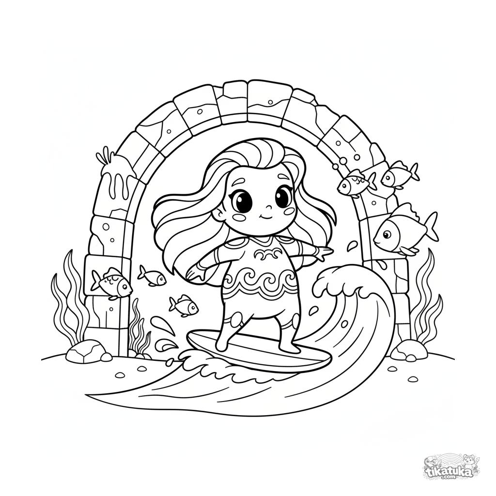 Ausmalbild für Kinder 4-6: Ein Wasser-Superheld surft auf einer Welle durch uralte Unterwassersteinbögen, Fische schwimmen in der Nähe.
