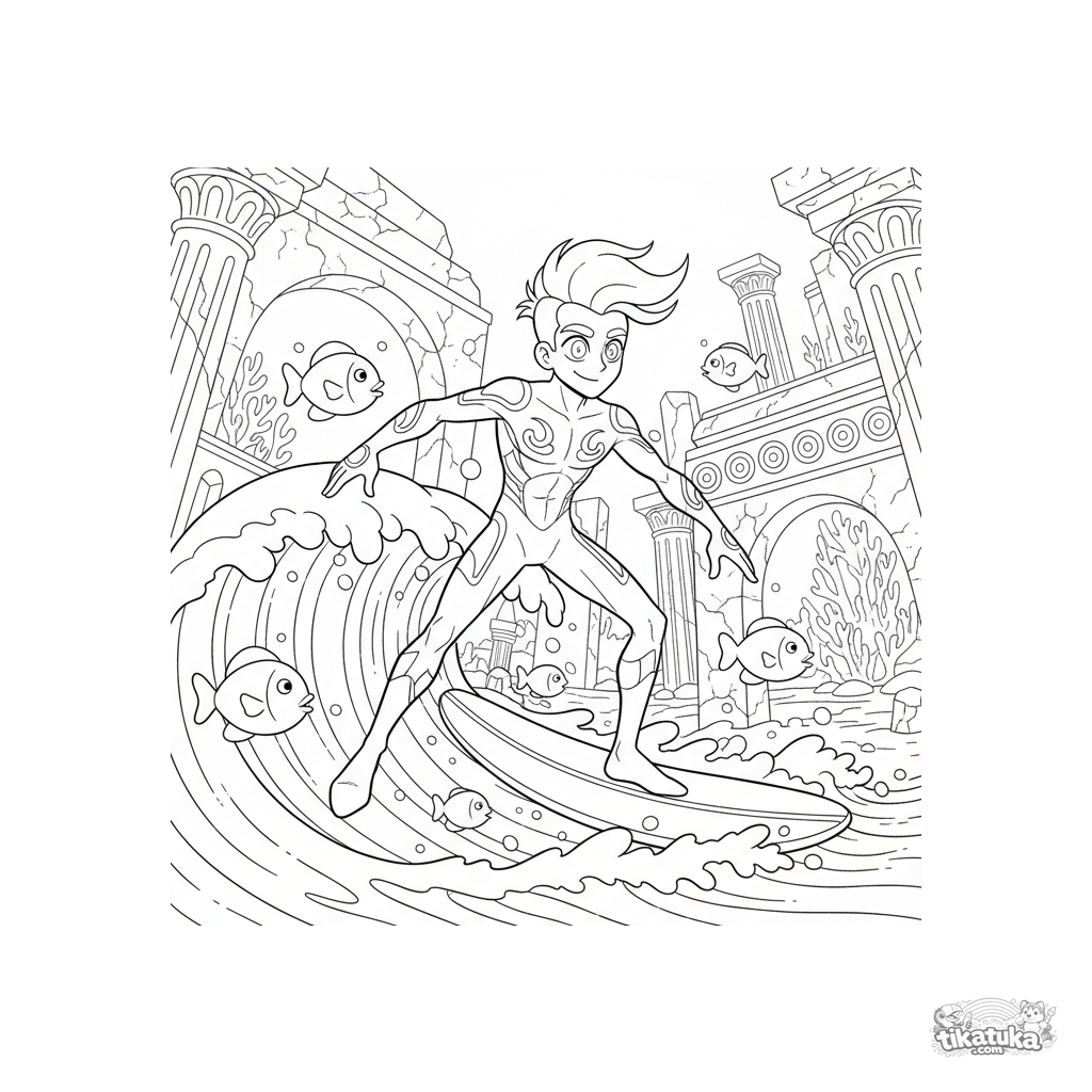 Ausmalbild für ältere Kinder 10-12: Ein wasserkontrollierender Superheld surft eine Welle durch die Bögen einer versunkenen antiken Stadt.