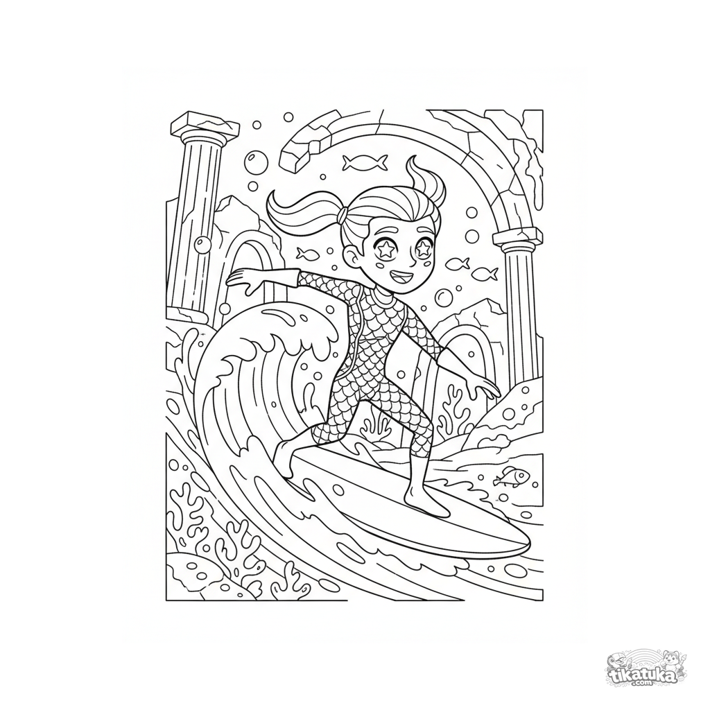 Ausmalbild für Kinder 4-6: Ein Superheld mit Wasserkräften surft eine Welle an alten Unterwasser-Ruinen. Lustige Szene im 90er-Cartoon-Stil.