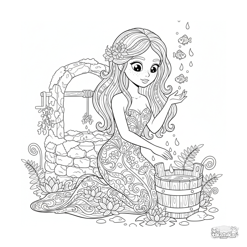 Detailliertes Ausmalbild für Kinder 10-12: Ein Wassermädchen mit schilfartigem Haar blickt auf ihr Spiegelbild in einem Eimer lebendigen Wassers am Brunnen. Mystische Szene im Art-Nouveau-Stil mit Fischen und Farnen.