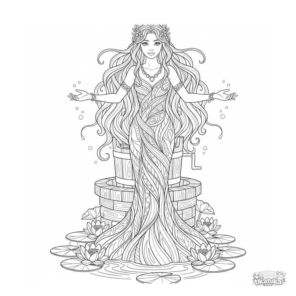 Komplexes Ausmalbild für 10-12 Jahre: eine Wassernymphe, die aus einem Brunnen mit lebendigem Wasser auftaucht. Art-Nouveau-Stil, fließende Linien, mystische Folklore-Bild.