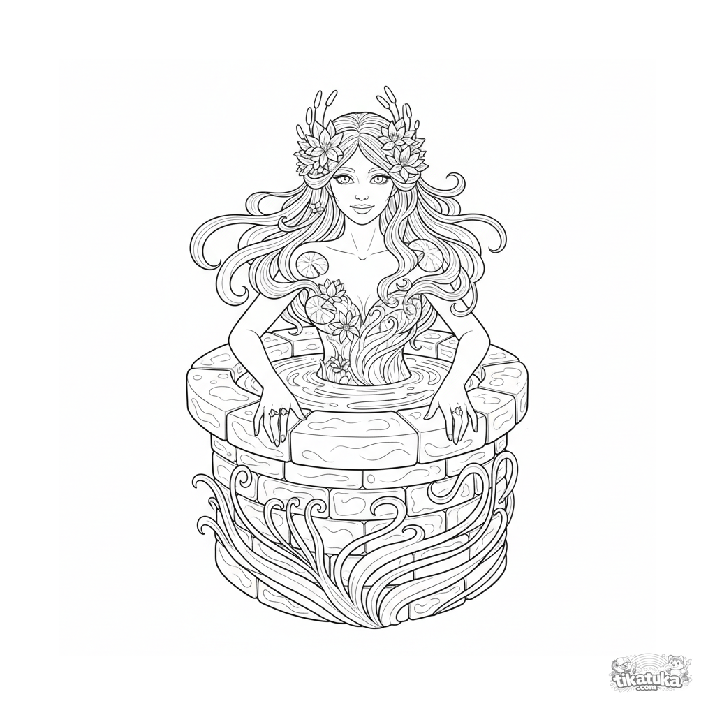 Detailliertes Ausmalbild für Kinder 10-12: Eine Wassernymphe im Jugendstil taucht aus dem Brunnen des lebendigen Wassers auf. Komplexe Linienführung, Seerosen, fließendes Haar und Wasserformen.