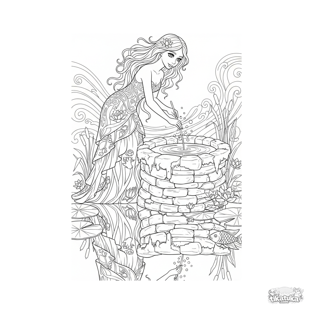 Ausmalbild für ältere Kinder 10-12: Eine anmutige Wassernymphe am Brunnen des lebendigen Wassers. Komplexe fließende Linien im Jugendstil.