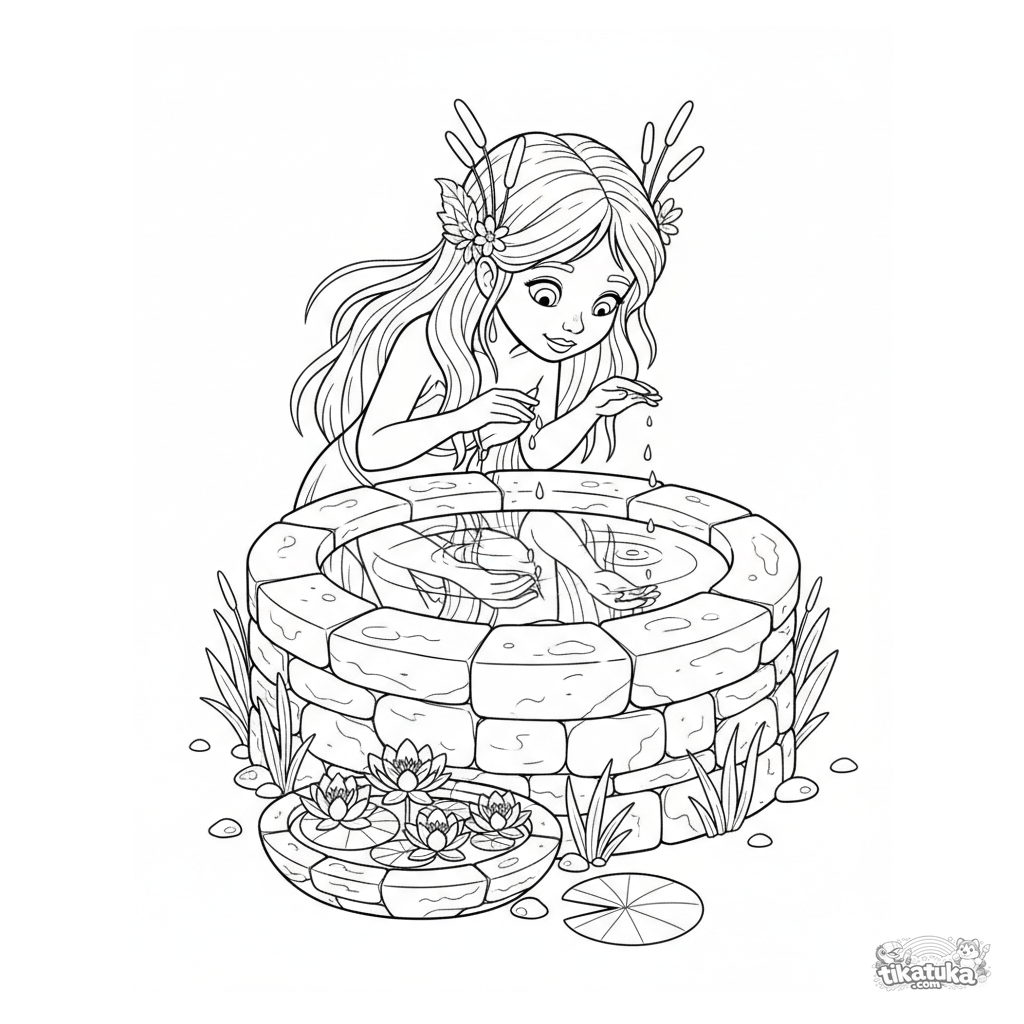 Ausmalbild für Kinder 7-9: Eine zarte Wassernymphe blickt in die Tiefe des Brunnens mit lebendigem Wasser. Realistische Szene mit Spiegelung, Tropfen und Seerosen.