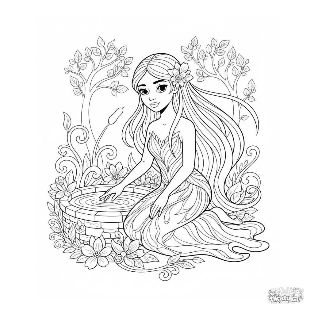 Ausmalbild für Tweens 7-9: Ein anmutiges Wassergeist-Mädchen am Brunnen mit lebendigem Wasser. Fließende Linien, Folkloremotiv, mäßiges Detail.