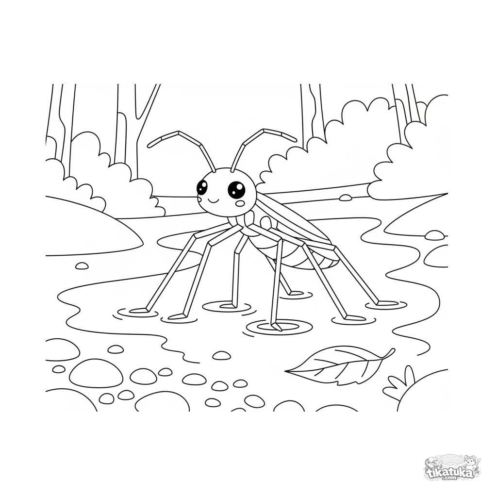 Ausmalbild für Kinder 4-6: Ein zarter Wasserläufer steht auf seinen langen Beinen auf der Oberfläche eines ruhigen Baches. Geometrischer Minimalstil.