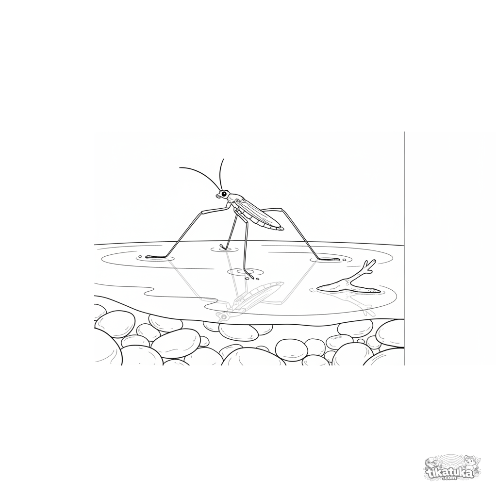 Ausmalbild für Kinder 7-9: Ein Wasserläufer-Insekt steht auf der Oberfläche eines ruhigen Waldbachs. Faszinierende Mikrowelt-Szene im technischen Blaupausen-Stil.