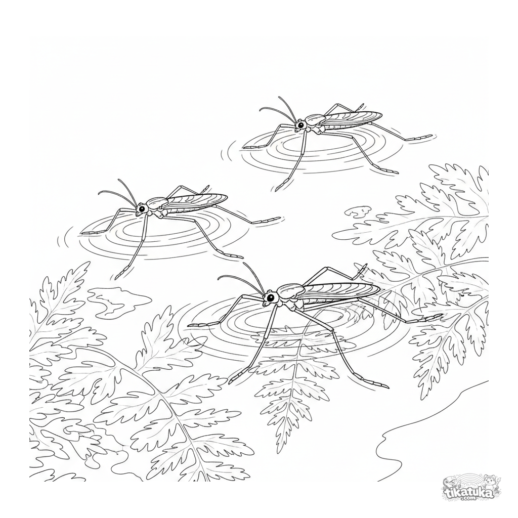 Ausmalbild für ältere Kinder 10-12: Detaillierte Wasserläufer-Insekten gleiten auf der Oberfläche eines klaren Baches. Szene im Stil eines alten Stichs.
