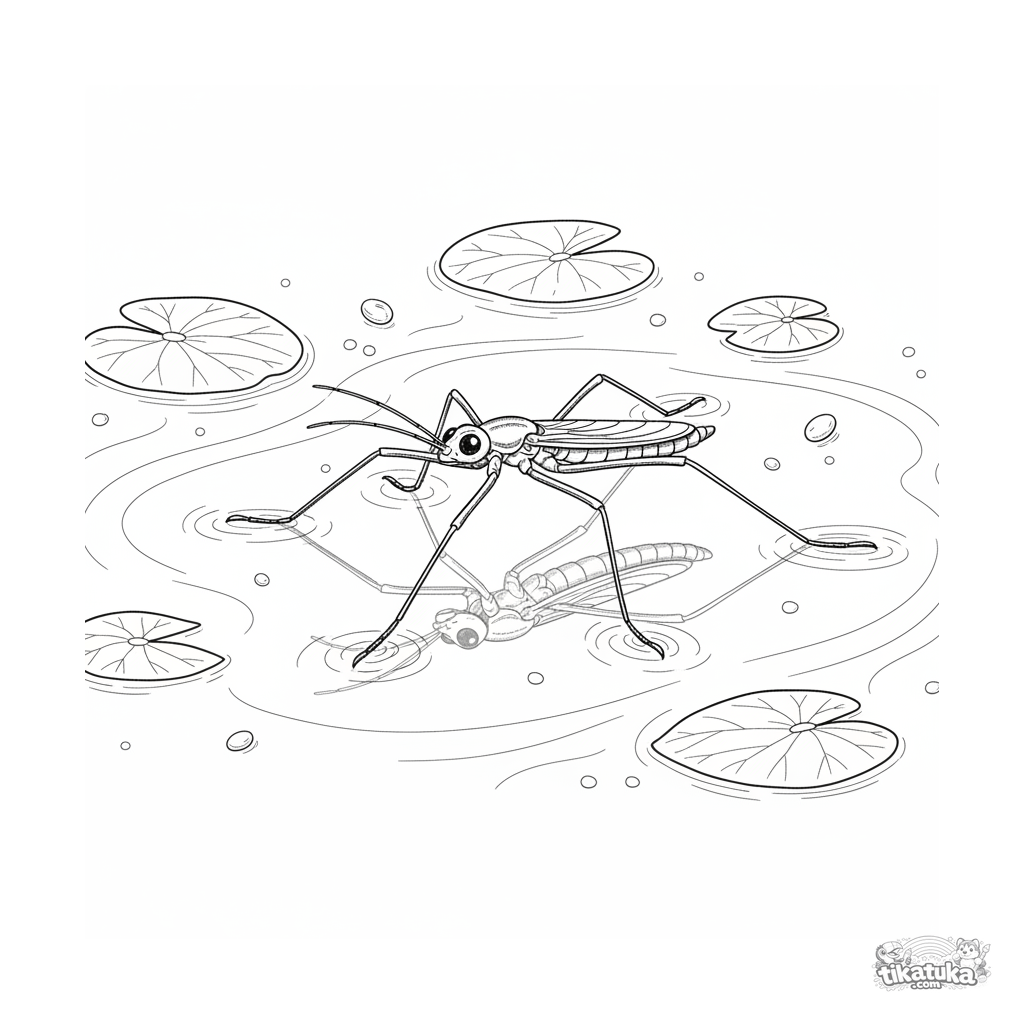 Detailliertes Ausmalbild für Kinder 10-12: Ein Wasserläufer-Insekt steht auf der Oberflächenspannung eines klaren Baches. Vintage-Stich-Stil, präzise anatomische Details.