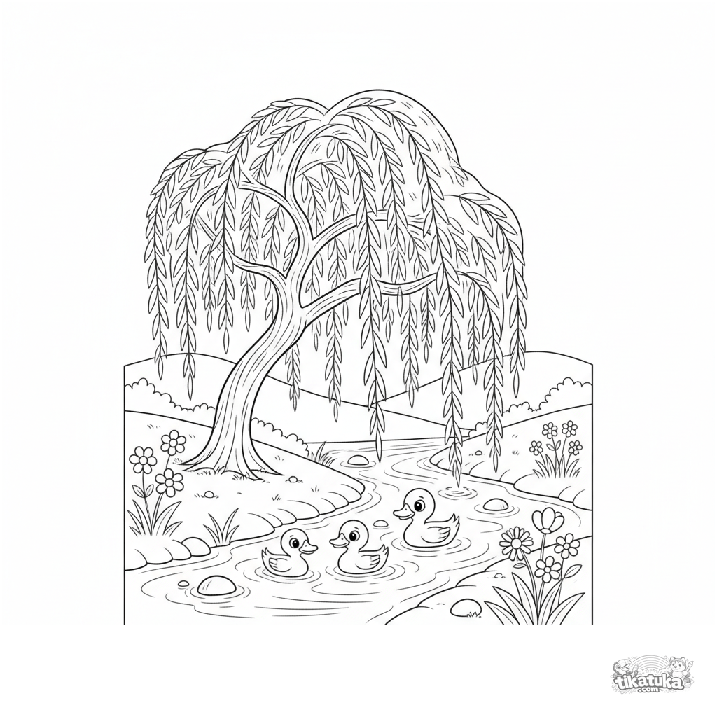 Landschafts-Ausmalbild für Kinder 7-9 im Aquarellskizzen-Stil: Eine Trauerweide neigt sich über einen mäandernden Bach, mit schwimmenden Enten. Leichte, fließende Linien.