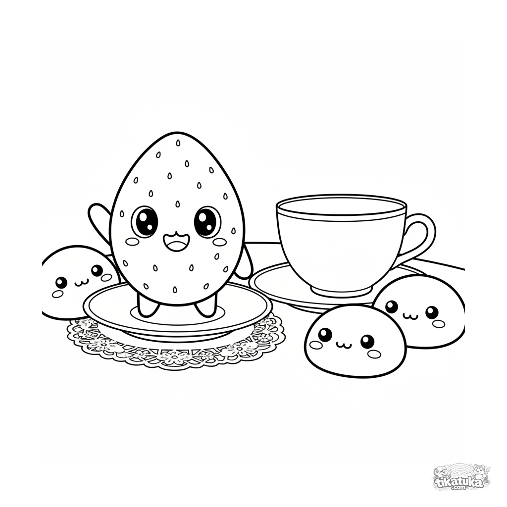 Ausmalbild für Kinder von 4-6 Jahren: ein lächelnder Erdbeer-Mochi winkt von einer Teeuntertasse im niedlichen Kawaii-Stil.