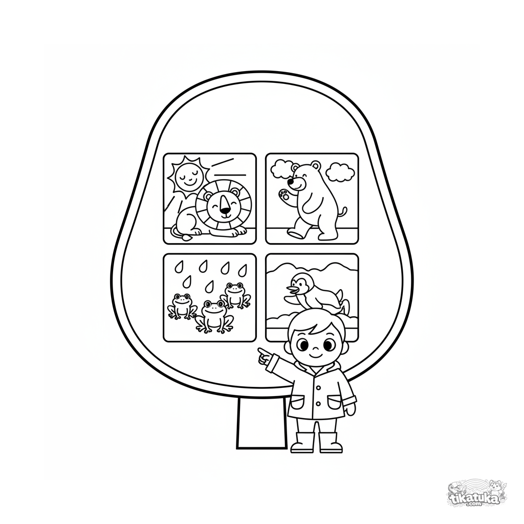 Ausmalbild für Kleinkinder 2-3: Eine einfache Zoo-Tafel zeigt Wettersymbole und passende aktive Tiere. Große, klare Formen.