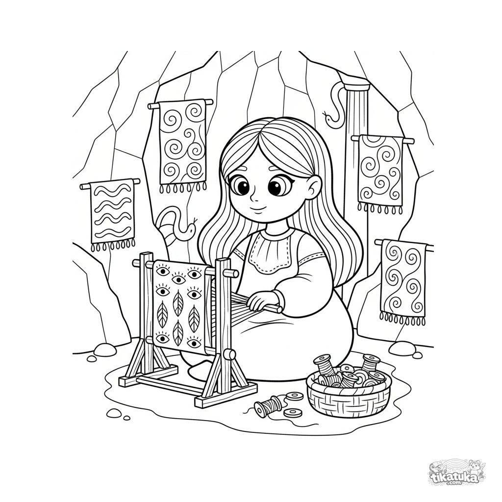 Ausmalbild für Kinder 7-9: ein Webermädchen am Webstuhl in der Gorgonenhöhle. Russischer Volksdruck-Stil, interessante Muster zum Ausmalen.