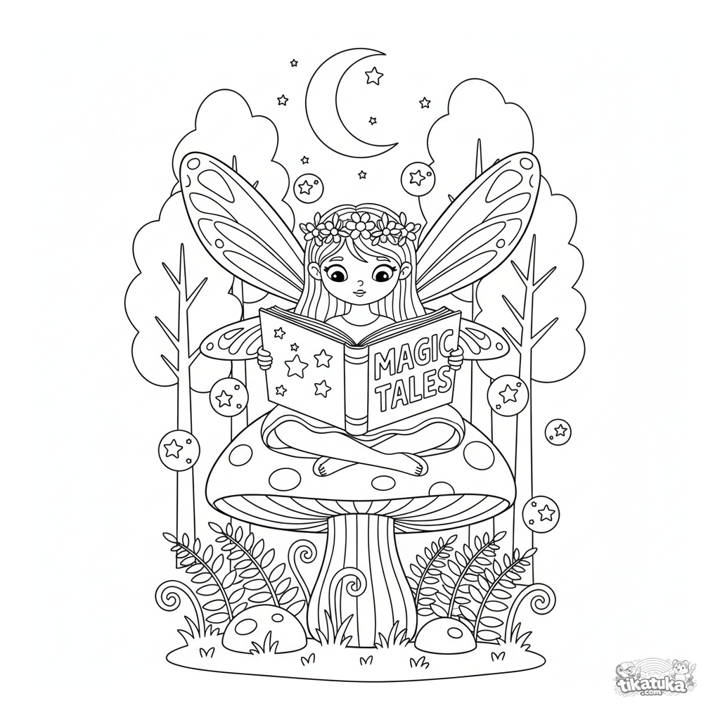 Ausmalbild für Mädchen 4-6: Eine Fee mit Libellenflügeln liest ein Riesenbuch, während sie auf einem Pilzhocker in einer Waldlichtung sitzt. Magische Szene.