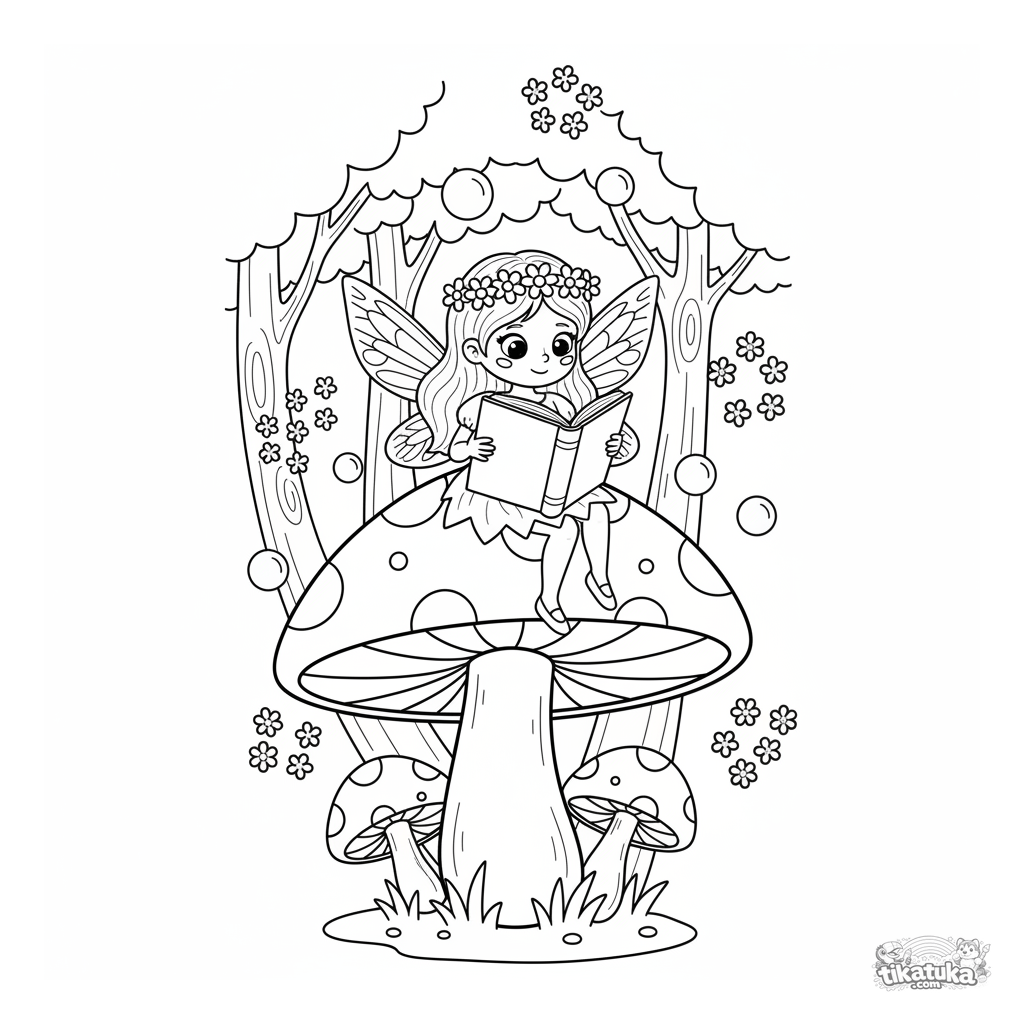 Ein Ausmalbild eines süßen Feenmädchens, das auf einem Riesenpilz im Zauberwald liest. Für Mädchen von 4-6 Jahren. Fördert Kreativität.