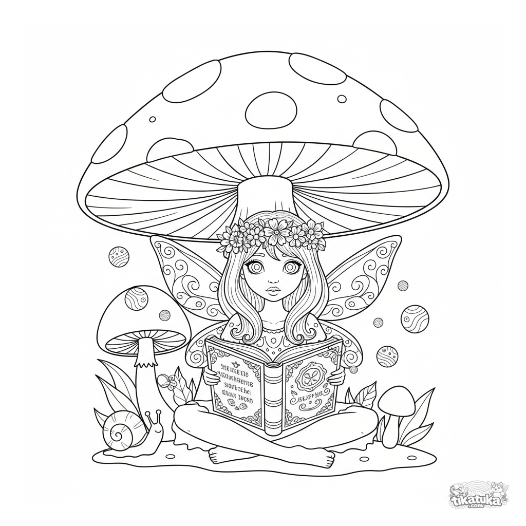 Ausmalbild eines Feenmädchens, das unter einem Riesenpilz ein Zauberbuch liest. Für Mädchen von 4 bis 6 Jahren.