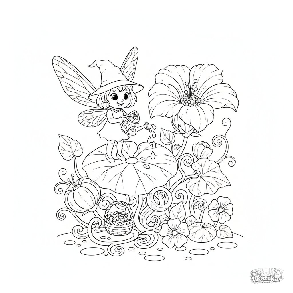 Ausmalbild für Mädchen von 4-6 Jahren: eine niedliche Gartenfee gießt eine riesige Kürbisblüte in einem magischen Garten. Einfache Details, freundlicher Ausdruck.