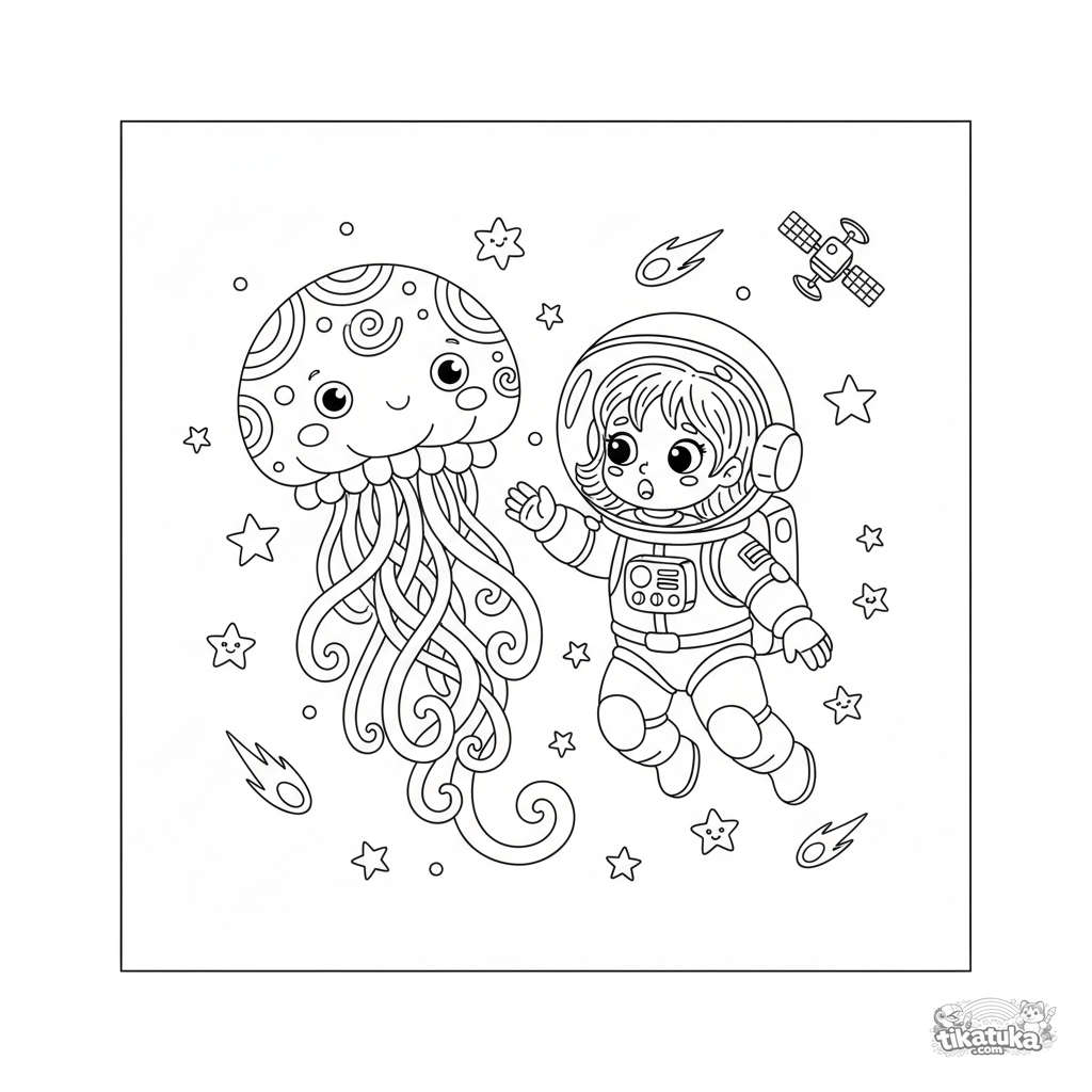 Ausmalbild für Mädchen von 6-9 Jahren: Ein Mädchen-Astronaut trifft auf eine riesige freundliche Qualle im Weltraum. Szene voller Wunder und Sternenwesen.