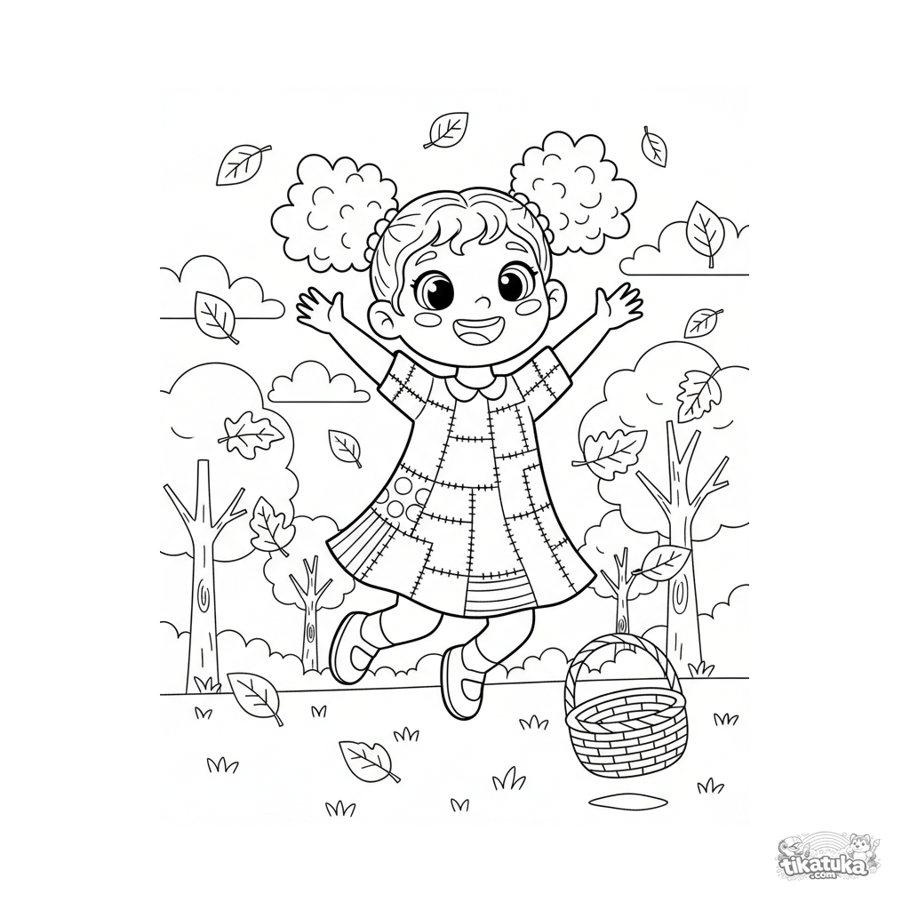 Ausmalbild für Mädchen 4-6: ein fröhliches Mädchen im Flickenkleid jagt fallende Herbstblätter im Park. Eine helle, dynamische Szene zum Ausmalen.