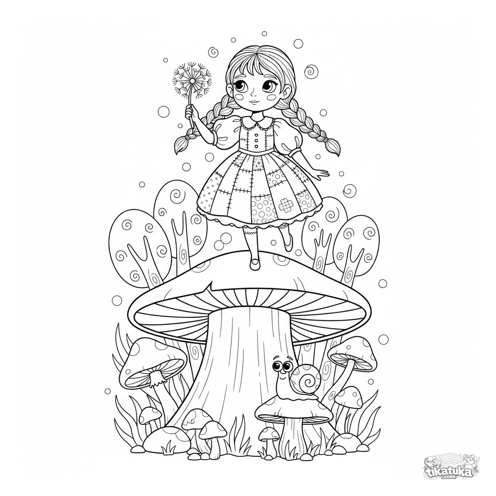 Ausmalbild eines fantasievollen Mädchens im Patchworkkleid, das auf einem riesigen Pilzstumpf im Zauberwald balanciert. Für Kinder von 5-8 Jahren.