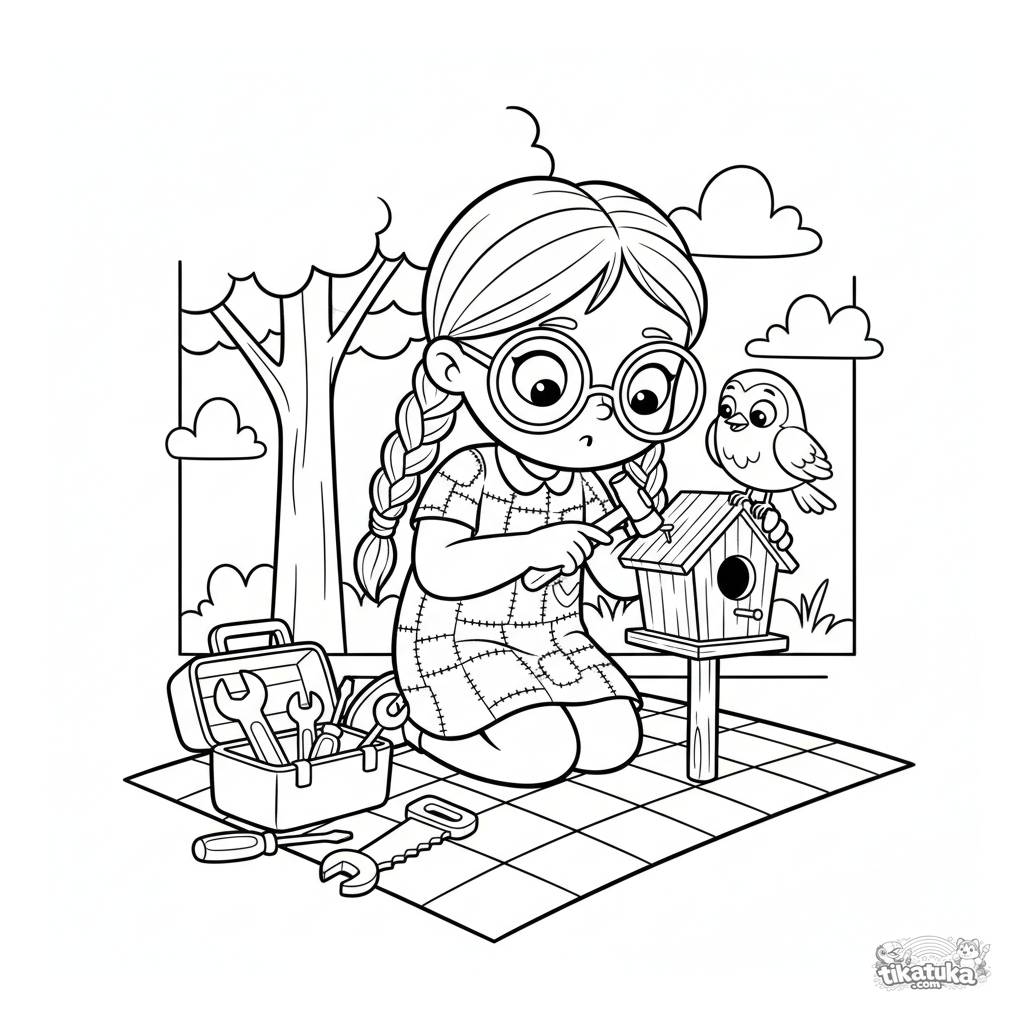 Ausmalbild für Kinder 5-8: Ein Mädchen im Flickenkleid mit Zöpfen baut ein Vogelhaus auf einer karierten Decke, ein neugieriges Rotkehlchen sitzt auf ihrer Schulter.