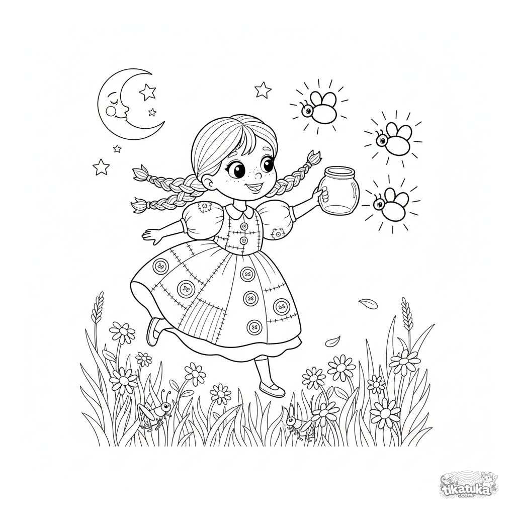 Ausmalbild eines Mädchens im Flickkleid, das Glühwürmchen auf einer Sommerwiese jagt. Für Kinder von 5-8. Mit Glas, Gänseblümchen und Halbmond.