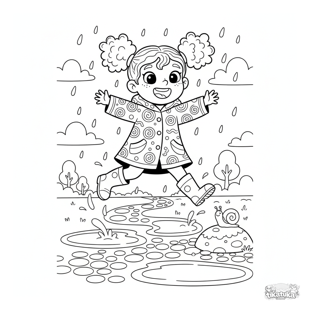 Ausmalbild für Mädchen: ein fröhliches Mädchen im Regenmantel springt über Pfützen. Für Kinder von 5-8 Jahren. Die Szene zeigt Freude und Bewegung an einem regnerischen Tag.