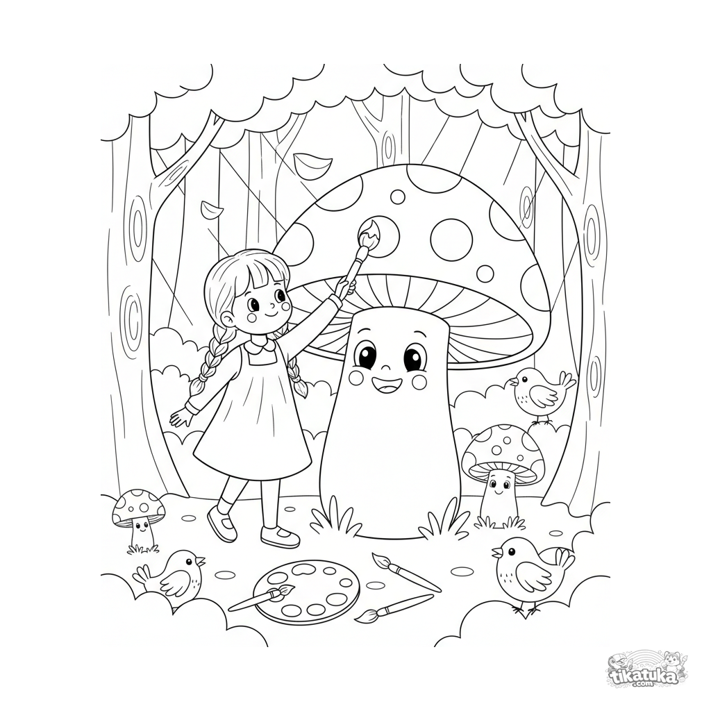 Ausmalbild für Mädchen: ein Kind malt einen Riesenpilz im Wald. Für 5-7 Jahre. Eine kreative Szene mit Palette und Pinseln, einfach auszumalen.