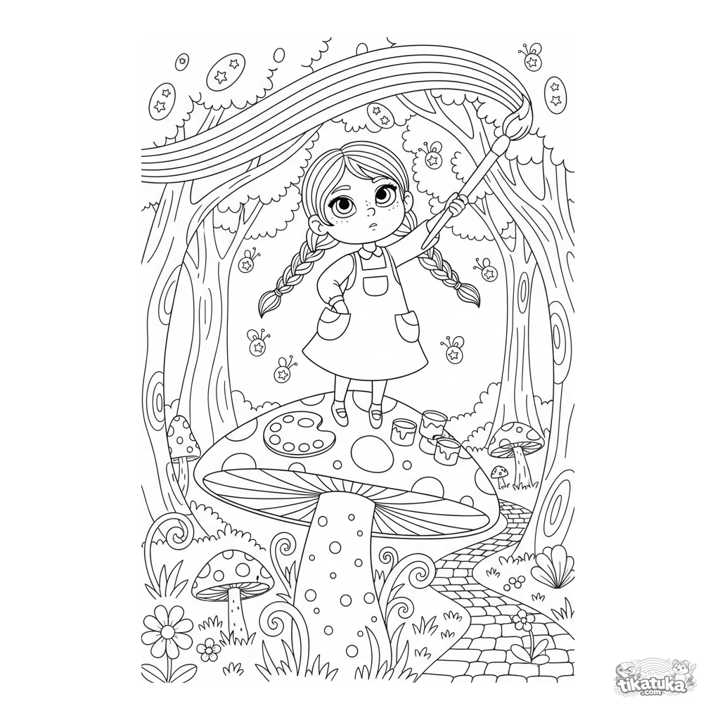 Ausmalbild eines magischen Mädchens, das einen Regenbogen malt, während es auf einem Riesenpilz steht. Für Kinder von 5 bis 8 Jahren.