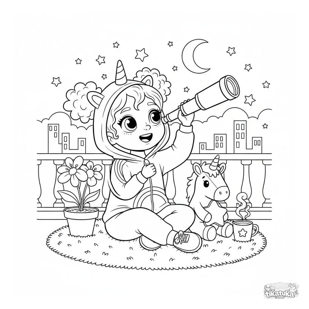 Ausmalbild für Mädchen: ein Kind im Einhorn-Schlafanzug mit einem Teleskop auf einem Nachtbalkon. Für Kinder von 5-8 Jahren. Enthält ein Einhorn-Stofftier, ein Sternenkissen und eine Nachtblume.