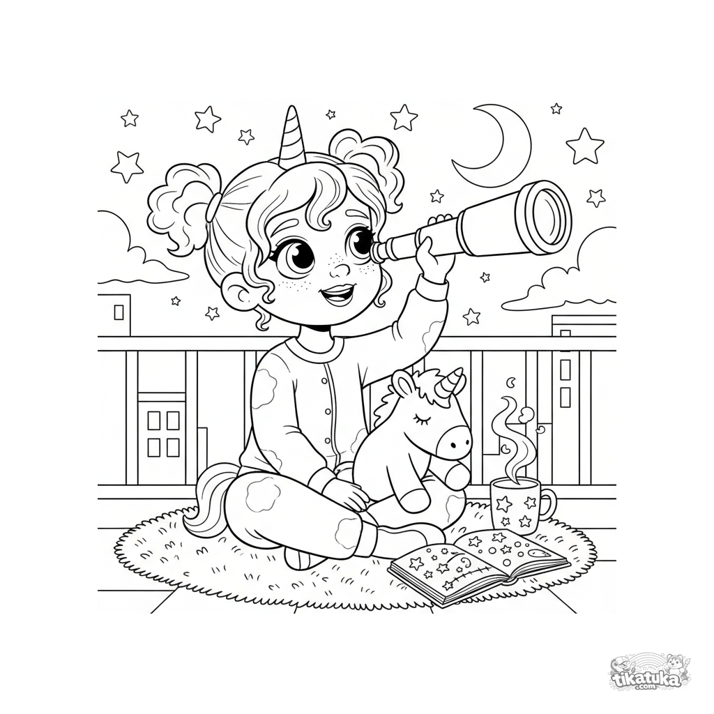 Ausmalbild für Mädchen: Ein phantasievolles Mädchen im Einhorn-Schlafanzug beobachtet mit einem Teleskop Sterne auf einem Balkon. Für Kinder von 5-8 Jahren.