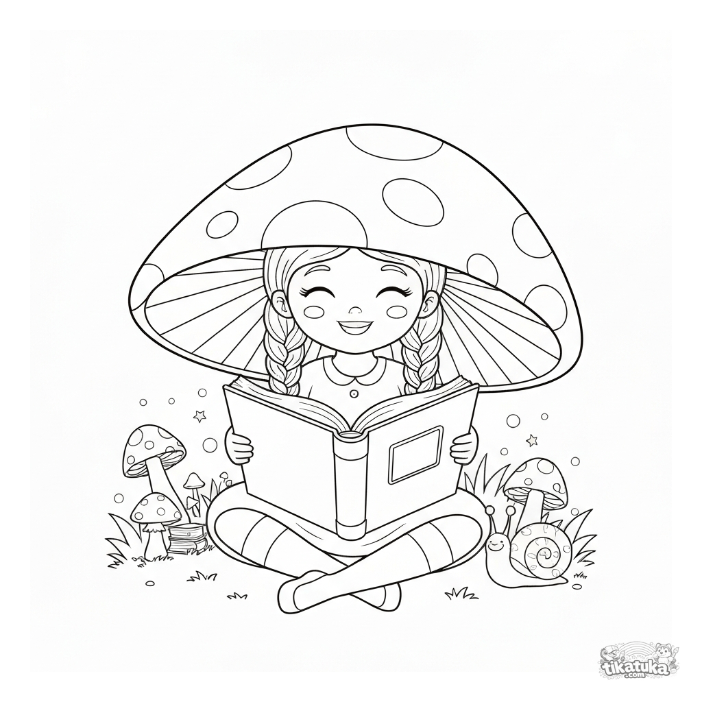 Ausmalbild eines Mädchens, das ein riesiges Buch unter einem Pilzdach liest. Für Kinder von 5-8 Jahren. Magische Szene mit einer Schnecke und leuchtenden Pilzen.