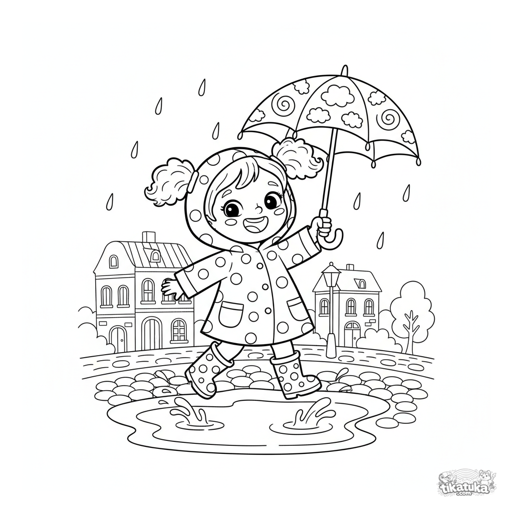 Ausmalbild für Kinder 5-7: Ein fröhliches Mädchen im Regenmantel springt in eine Pfütze mit einem Regenbogen-Regenschirm. Aktive Szene mit ausgewogenen Details.